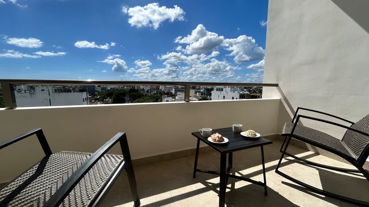 Featuring a luxurious king size bed and a comfortable sofa, the space extends to a lovely balcony with captivating city views.