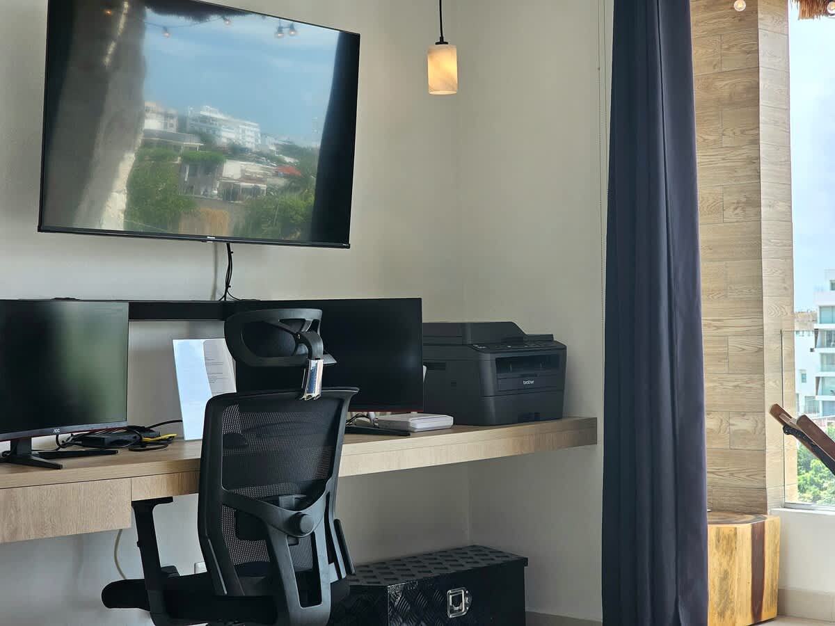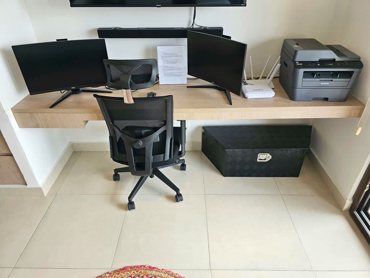 Work remotely in style with a printer, sound system, and dual monitors 🖥️🖨️