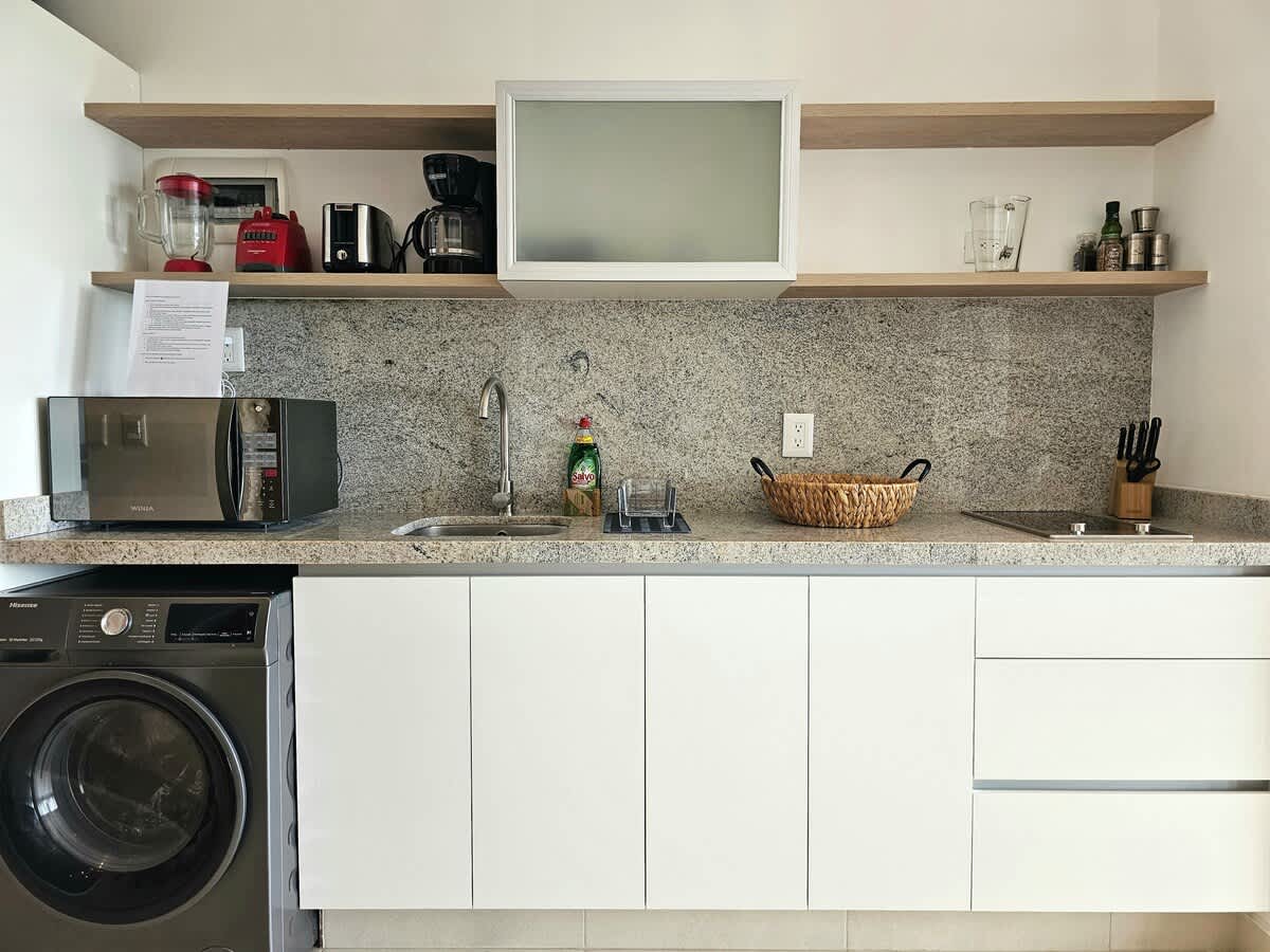 The fully equipped kitchen is perfect for whipping up beach snacks, and the washer/dryer lets you pack light.