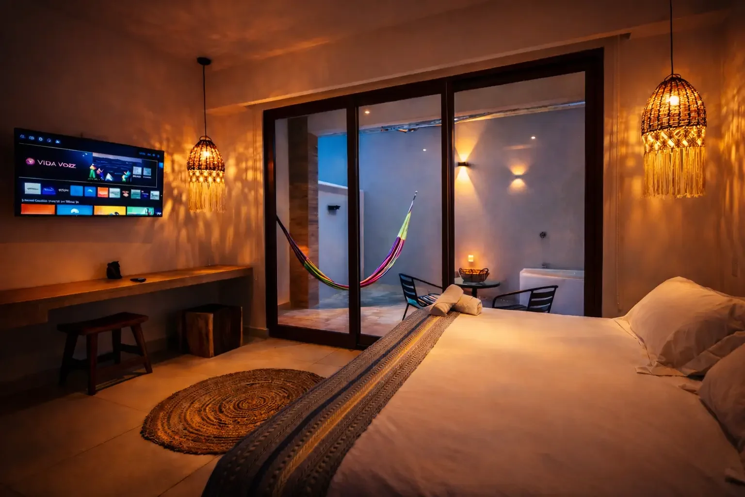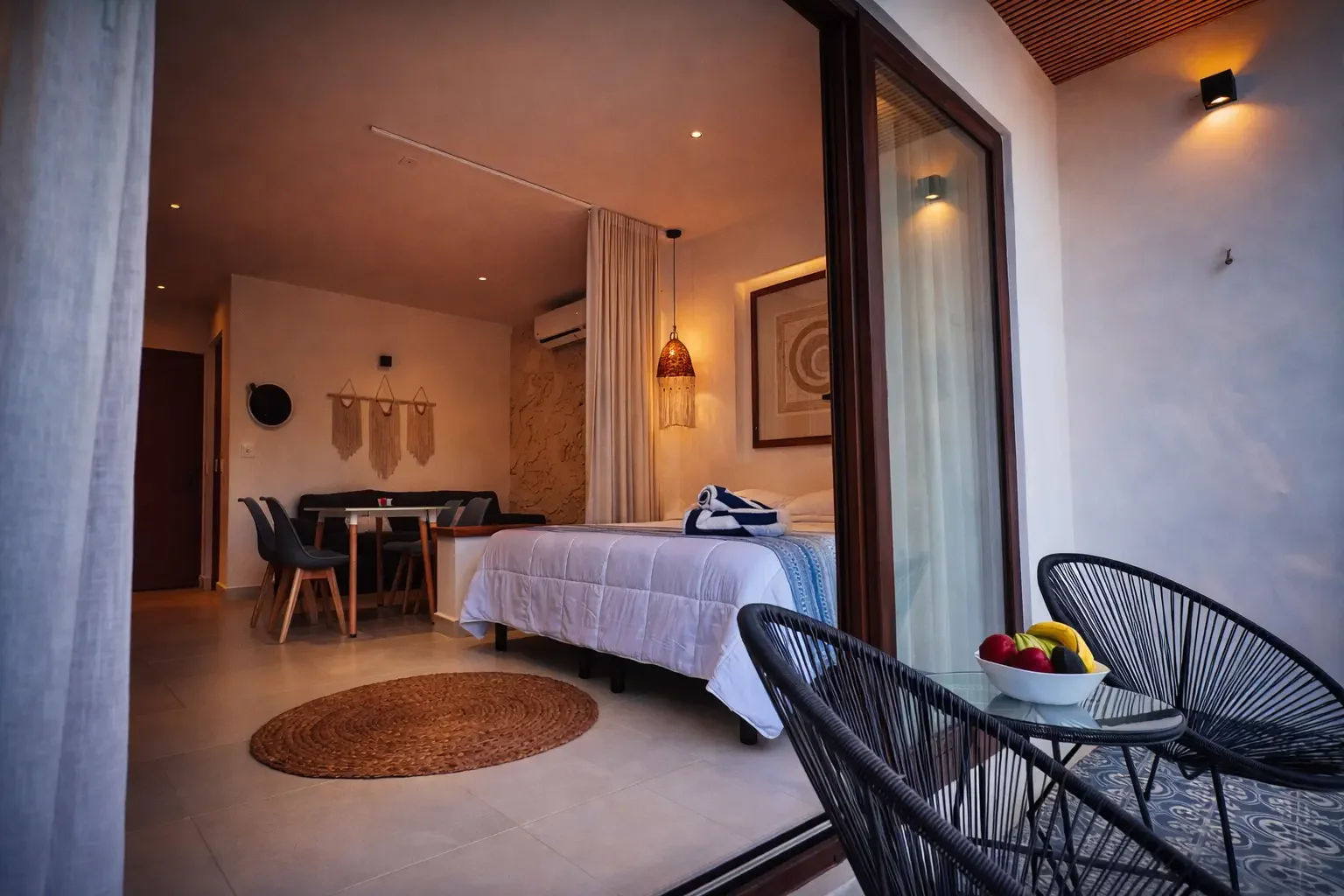 This stylish studio features an indoor freestanding bathtub, minimalist decor, and a prime location near the beach and Quinta Avenida. It's made for couples who want to unwind in privacy.
